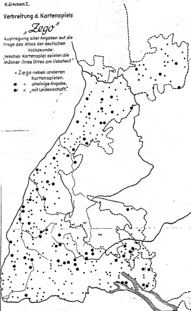 Spannend, ob im Elsass zu dieser Zeit auch noch Cego gespielt wurde. Es wurde nicht in die Umfrage einbezogen, da das Elsass in den 30er Jahren zu Frankreich gehörte.