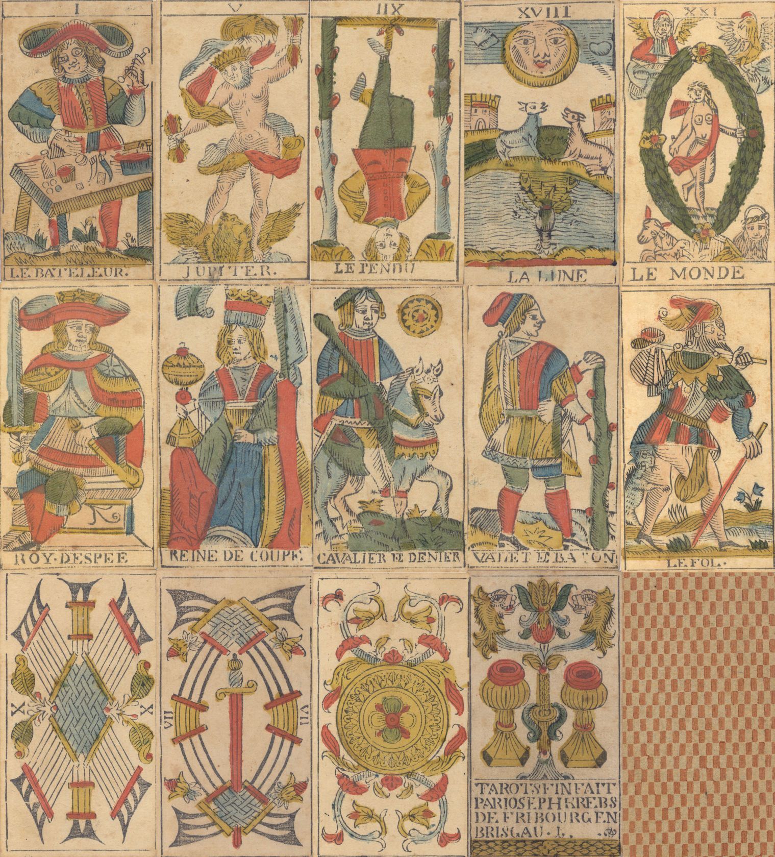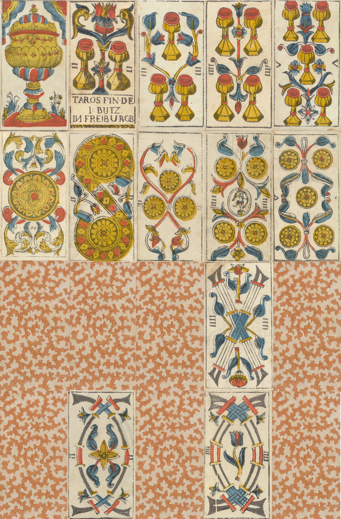 Die abgebildeten Karten die im Original im Augustinermuseum liegen, sind auf 54 Karten reduziert worden. Das Blatt ist neben dem Tarot de Besançon von F. Kechler in Kehl eines der sehr alten Spiele, die im Museum in reduzierter Form vorliegen. Auch dieses Blatt ist ein Hinweis darauf, dass man in der Region um Freiburg und Kehl möglicherweise bereits sehr früh im 19. Jahrhundert Tarockvarianten mit 54 Karten spielte, bevor Cego erfunden wurde. Die Vermutung liegt nahe, dass mit diesen Karten damals Dappen gespielt wurde.