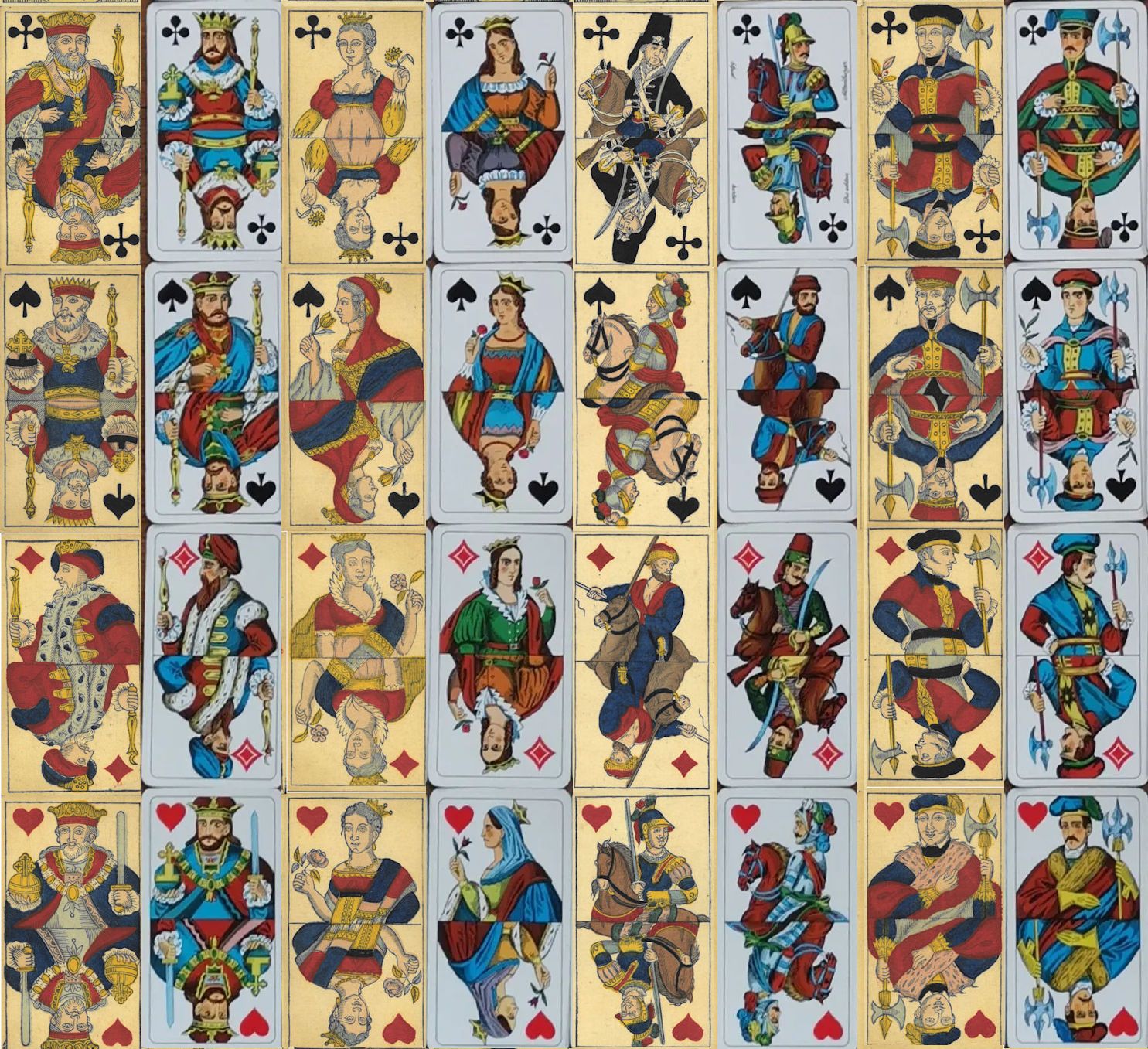 In der obersten Reihe ist das uns allen bekannte Cegoblatt. Es hat wie das österreichische Tarockblatt 54 Karten und keine Indizes. Das sind die kleinen Buchstaben und Zahlen in den Kartenecken. Das K beim König oder die Eins auf dem As, wie man sie auch bei Skatkarten kennt. Die Ziffern der Trümpfe sind arabisch und zentral in der Mitte.