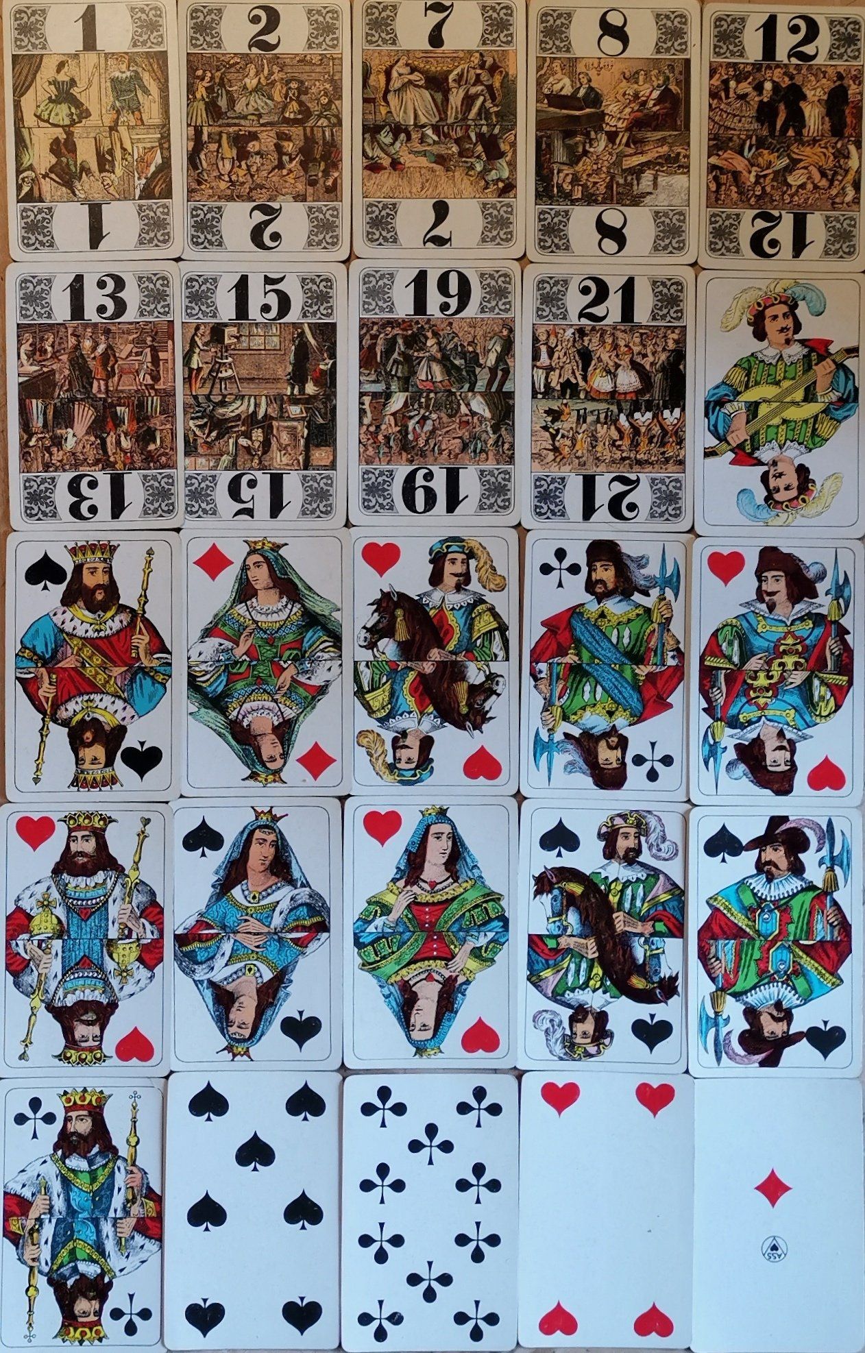 Das abgebildete Blatt wurde 2018 ebenfalls von Piatnik noch einmal gedruckt. Es ist im Netz selbst bei Amazon wieder für knapp 25 € zu haben. Heute wird das Blatt mit einer Wahrsage-Anleitung verkauft. Tatsächlich wurde ab 1780 das Wahrsagen mit diesen Karten populär.