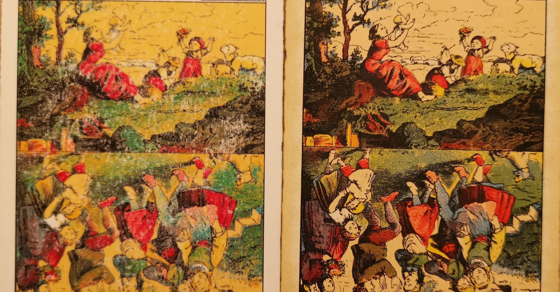 Auf 1 ist das Freiburger Münster. 2 zeigt die Hinrichtung Andreas Hofers dem Tiroler Freiheitskämpfer. 3 zeigt Napoleon, auf dem Russlandfeldzug vor dem brennenden Moskau. Daher die unglückliche Mine. 4 könnte der Rütlischwur in der Schweiz sein. Viele Darstellung zeigen bei diesem Ereignis drei Beteiligte. Historisch sind aber wohl nur zwei belegt. 5 zeigt wie Wilhelm Tell Gessler vom Pferd schießt. 6 gibt uns bislang noch Rätsel auf. Es zeigt einen sitzenden Ritter der eine goldene Schatulle überreicht bekommt. Die Trümpfe 7 bis 11 sind möglicherweise Darstellungen aus dem Osmanischen Reich oder spanische Mohamedaner. Sie könnten im Zusammenhang stehen mit Karl dem Großen dem Kreuzritter auf Trumpf 12, der auf 13 von Pabst Leo III zum Kaiser gekrönt wurde. Um welchen Krieg es auf 14 geht ist bislang nicht bekannt. Bei 15 könnte es sich um die Varusschlacht im Teutoburger Wald handeln, in der die Germanen die Römer besiegten. Auf 16 könnte es sich ebenfalls um Germanen handeln. Näheres ist auch hier (noch) nicht bekannt. Trumpf 17 finde ich spannend. Keine Ahnung was es darstellt. Von weitem erinnert es mich an ein gleichgeschlechtliches antikes Paar!? 18 bis 21 scheinen mir auch antike Darstellungen. Auf 18 vielleicht Odysseus, wie er zum Krieg nach Troja aufbricht? 19 stellt eine Weissagung dar, vielleicht über die Rückkehr von Odysseus . 20 schaut mir nach einer Göttin aus, die Kriegsgerät liefert, oder geliefert bekommt. Ich würde auf Athene tippen, wäre da nicht die gleiche Frau auf der 21. Athene galt wohl als sehr keusch. Um alle erhellenden Hinweise, über die Darstellungen auf den Trümpfen bin ich dankbar.