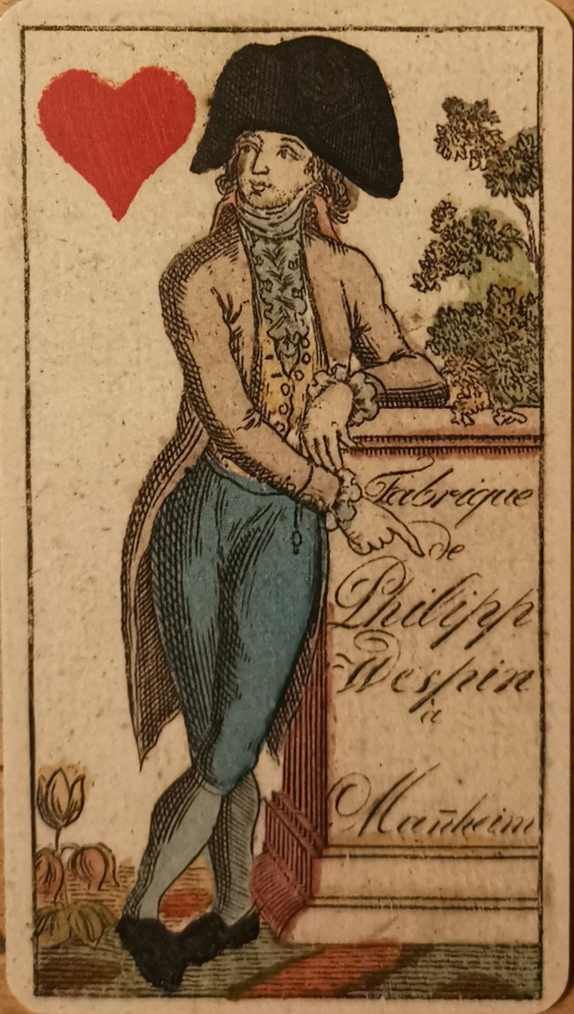 Zum Alter des Blattes: Der Sohn Philipp Wespin hatte die Karlsruher Niederlassung nur von 1830 -1834. Glaubt man dem Stein auf der Trumpf 2, müsste das Blatt also in dieser Zeit entstanden sein. Außerdem trugen die Trümpfe, wie in (Vorder-)Österreich üblich, noch römische Ziffern auch das weißt auf eine Herstellung im der ersten Hälfte des 19. Jahrhunderts hin. Quelle: Peter Endebrock/Jürgen Platz/Sigmar Radau, Spielkarten und Kartenmacher in Mannheim und der Kurpfalz (Studien zur Spielkarte 41), Berlin 2019