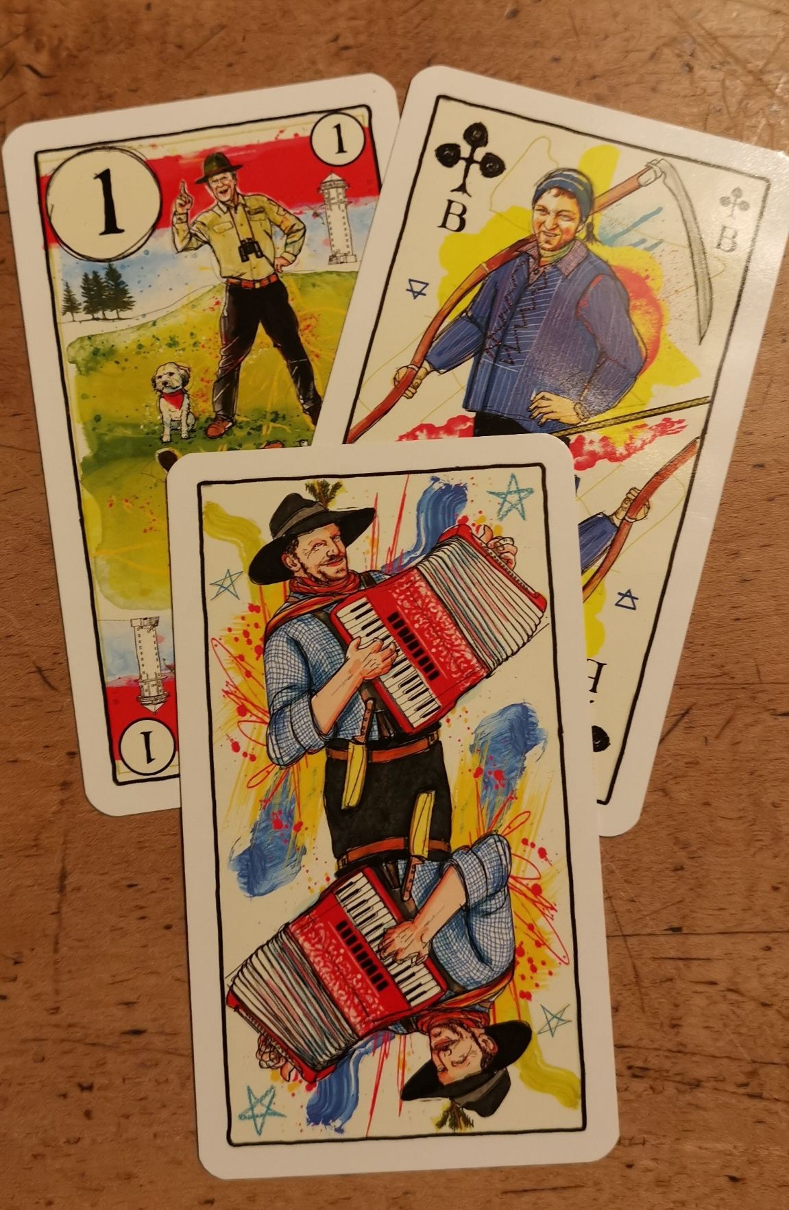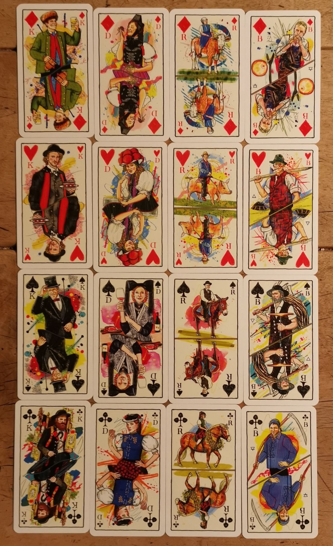 Das Blatt wurde für Linkshänder optimiert. Ähnlich wie bei den französischen Tarot-Karten kommen bei den Bildkarten K, D, R und B ins Eck und die Zählwerte der Trümpfe werden ebenfalls in die Ecken verschoben. Das ist eine Erleichterung für die Anfänger und die alten Hasen wird es nicht stören.