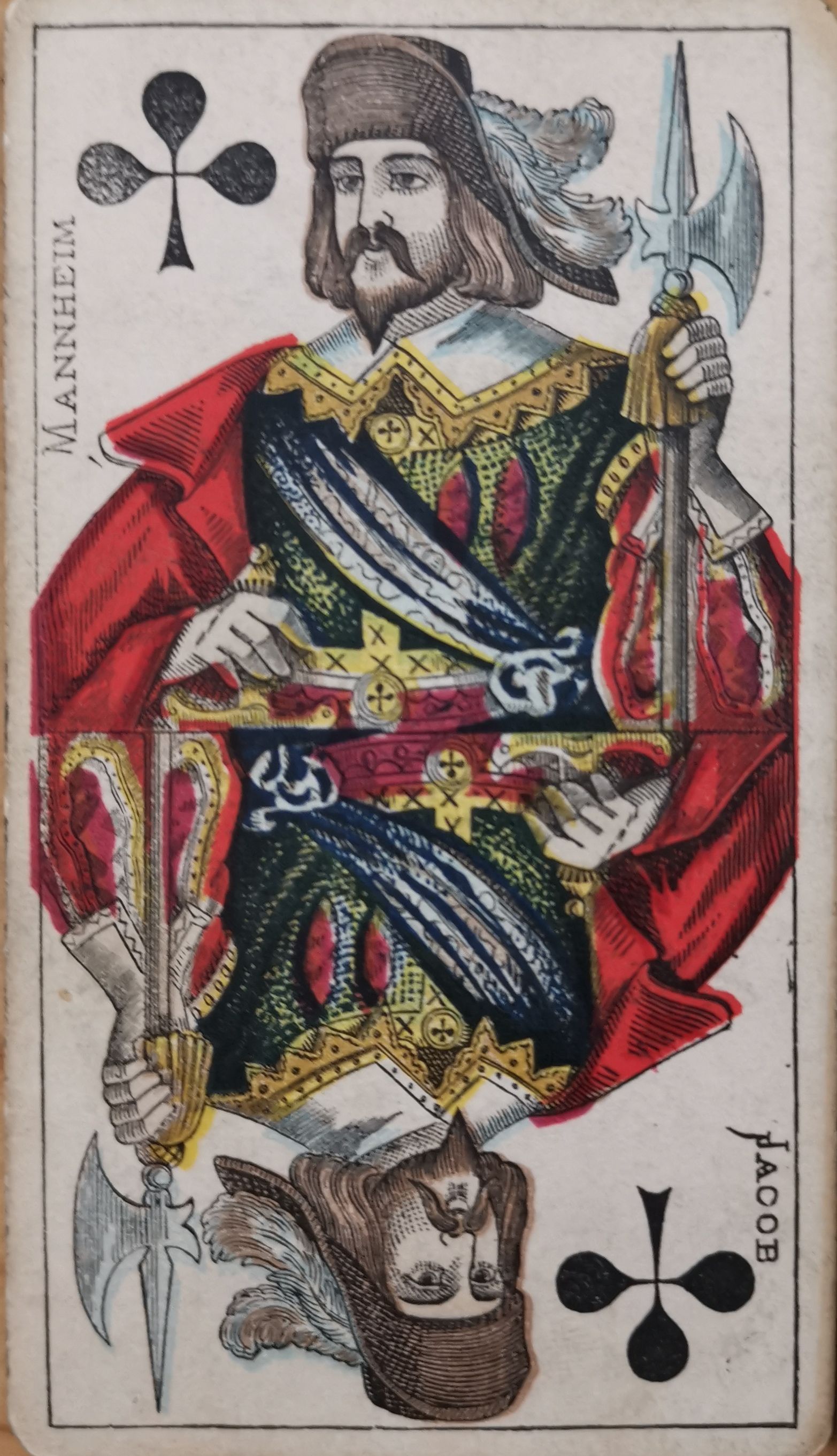 Trotz dieser ungewöhnlichen Subventionierung meldete die Firma schon drei Jahre später Konkurs an (1883) - nur, um buchstäblich am gleichen Tag unter dem Namen von Gustav Jacobs Sohn Georg Heinrich Philipp Jacob neu gegründet zu werden. Die Spielkartenherstellung lief möglicherweise noch bis 1912 weiter, die Firma lässt sich als Verlag noch bis 1933 nachweisen." Diese Informationen deuten auf eine recht "geschäftstüchtige" Familie hin. Danke Hansjörg Weckerlin für die Infos!