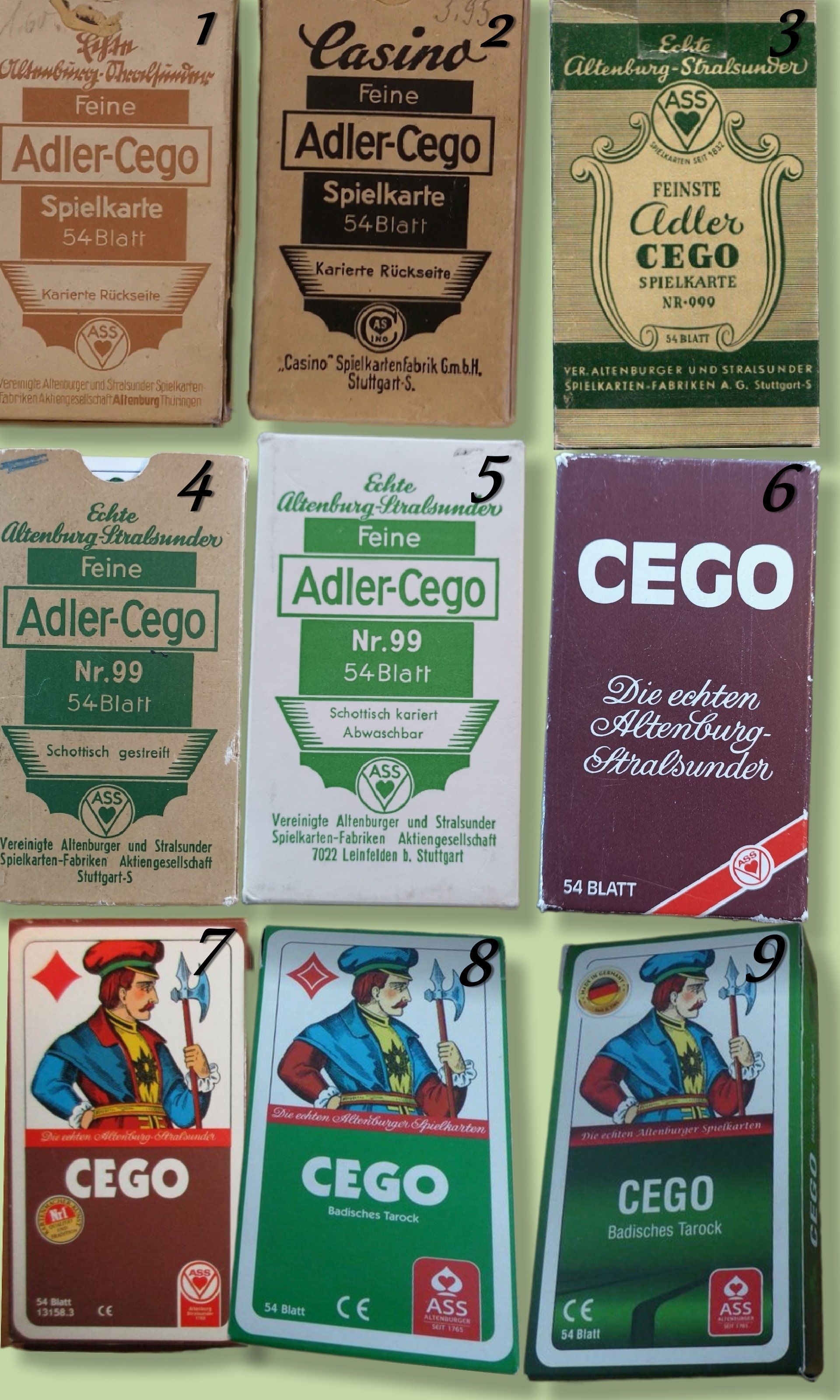Das heutige "Standardcego" mit den Tierdarstellungen wurde bis Mitte der 70er Jahre in grün-weißen Faltschachteln als „Adler-Cego“ verkauft. Der Name wird von dem Wappenadler stammen, der die Karo-Dame des ursprünglichen Herstellers Lennhoff & Heuser aus Frankfurt zierte. Die Firma existierte nur von 1879 bis1882. Sie gestaltete das Blatt in seiner heutigen Form und wurde gleich danach vom großen Konkurrenten der Vereinigten Stralsunder Spielkartenfabrik (VSS) übernommen. In der Nachkriegszeit wurde es in Leinfelden bei Stuttgart gedruckt, daher wirde es manchmal auch als Württemberger Blatt bezeichnet.