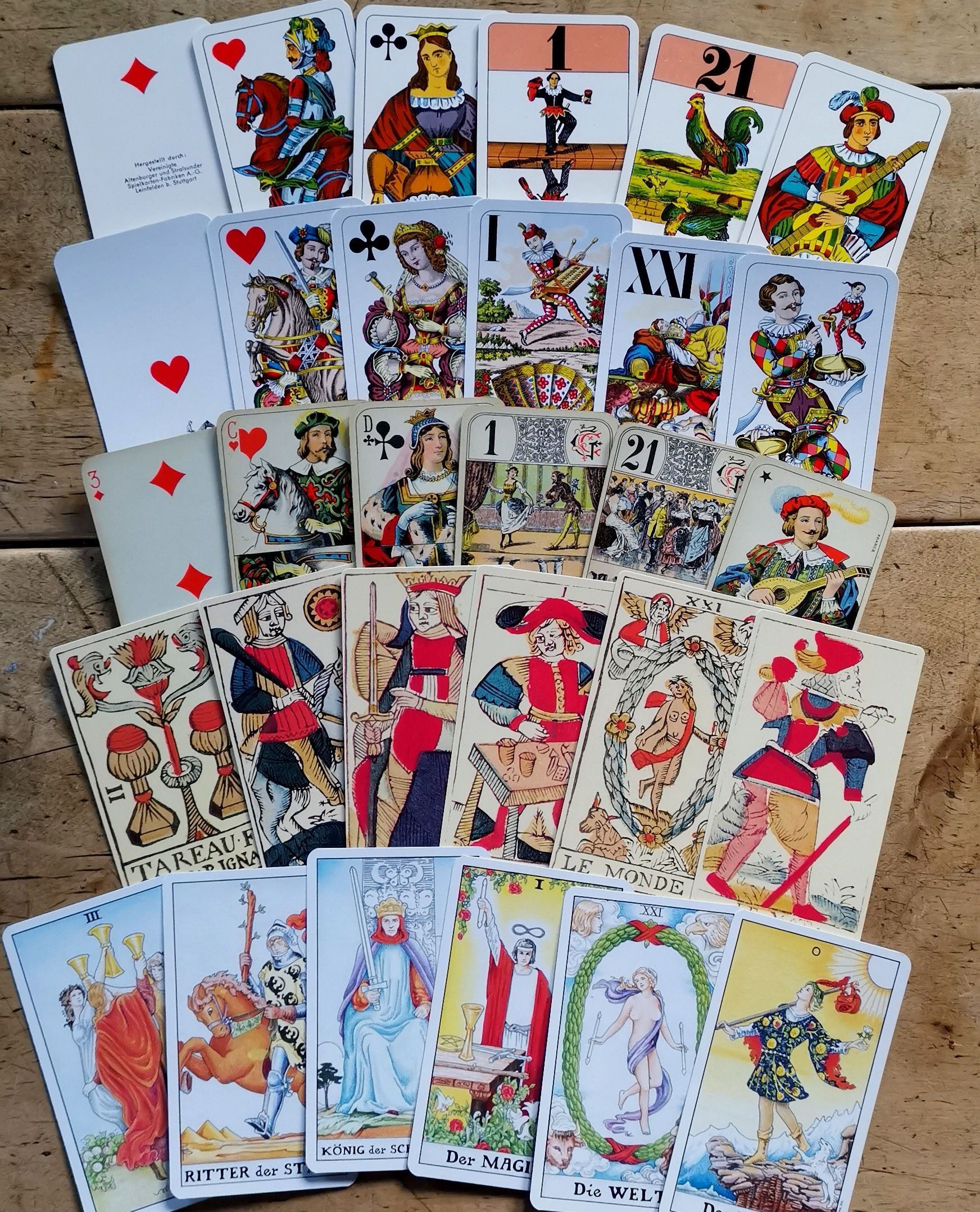In der letzten Reihe ist das Wait-Tarot mit 78 Karten aus dem Jahr 1910 zu sehen. Dieses Tarockblatt wird im Internet am weitaus häufigsten verkauft. Es wird bis heute ausschließlich zur Wahrsagerei genutzt. Auf einer Reise nach Skandinavien hatten wir das Vergnügen in einer Jugendherberge einer jungen Wahrsagerin ihre Karten zu entleihen und damit Cego zu spielen. Es ist gewöhnungsbedürftig, ging aber zum Schluss ohne Schwierigkeiten. Die Wahrsagerin war darüber nicht begeistert ;-)