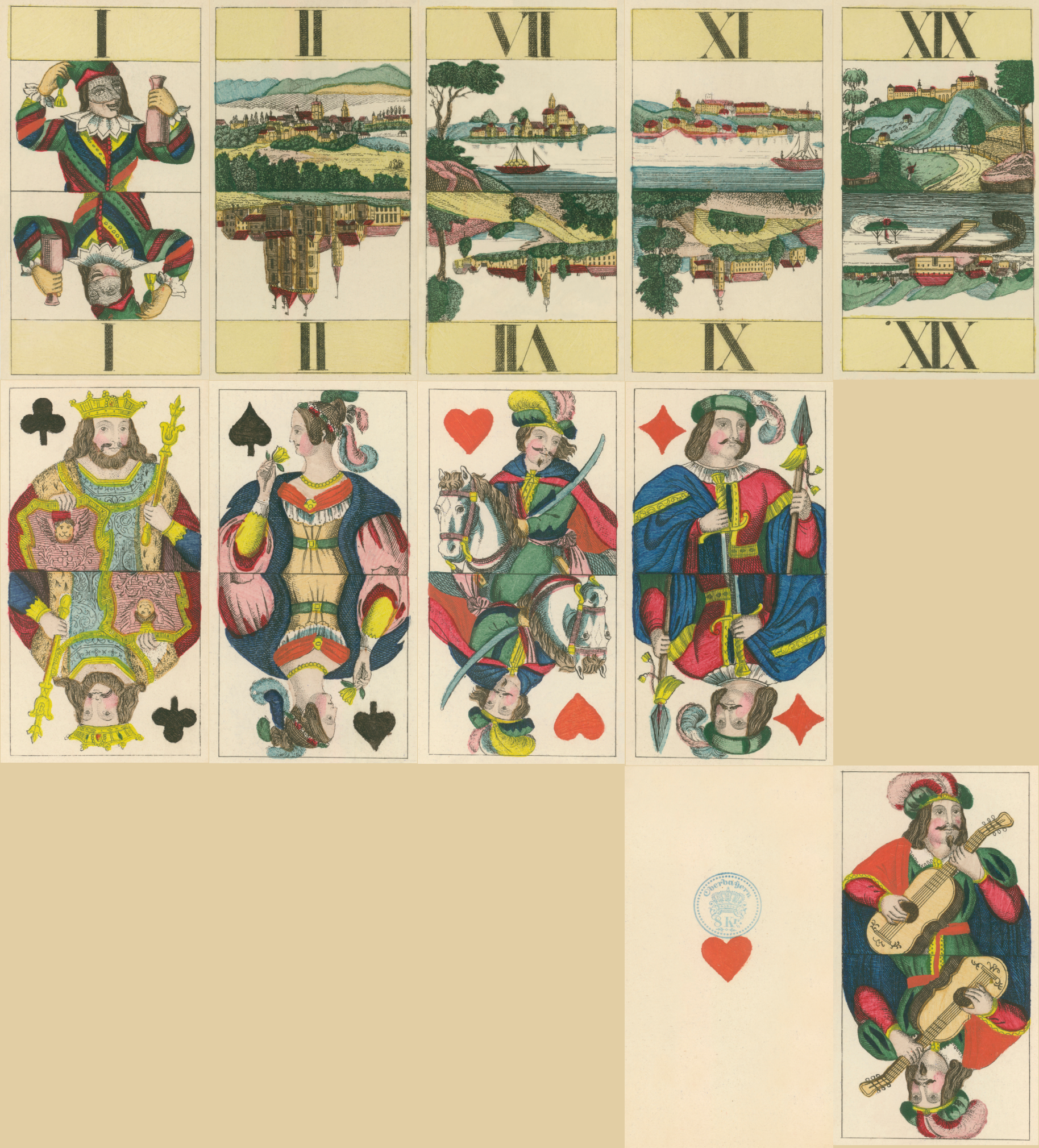 Der Steuerstempel auf Herz As zeigt, dass dieses Blatt zwischen 1854 und 1875 nach Oberbayern verkauft wurde. Ein Beleg, dass noch vor 150 Jahren Tarock in anderen deutschen Regionen gespielt wurde. Ansichten-Tarocke waren zu dieser Zeit sehr beliebt. Eine Kartenart, die leider inzwischen ausgestorben ist. Danke Klaus-Jürgen Schultz für die Informationen und das Recht, die Karten hier veröffentlichen zu dürfen.