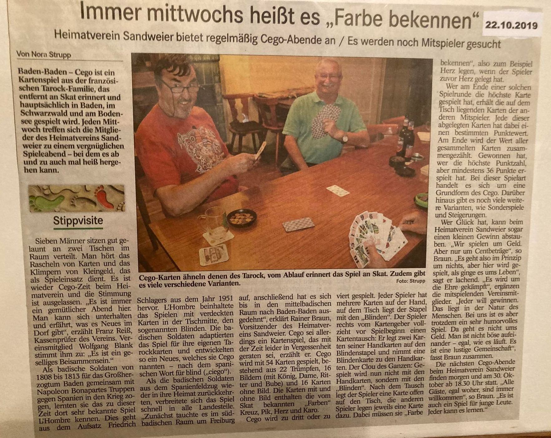 Sigrid Neiniger aus Brigachtal brachte die Cego-Regeln vom Turnier mit. Ganz herzlichen Dank dafür! Urloffen liegt 10 km nördlich von Offenburg zwischen Appenweier und Renchen. Die Regeln kann man als durchaus typisch für die Ortenau bezeichnen.
