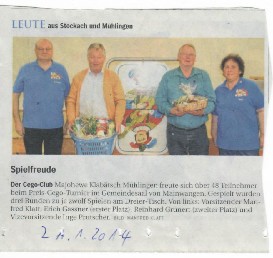 Wir befinden und im Hinterland vom Bodensee ca. 15 km nordöstlich von Stockach. Dort liegt der (zugegebenermaßen nicht allzu große) Ort Selgetsweiler, ein Ortsteil von Hohenfels. Dieser Ort kann mit Stolz von sich behaupten, dass im Jahr 2025 noch 15 % der Gesamtbevölkerung Cego spielen! Auch gibt es in dieser Gegend im Übergang vom Badischen zum Hohenzollerischen noch eine rege Turniertätigkeit. In Mainwangen feierte man 2025 Jubiläum. Es fand das fünfzigste Turnier des Cego-Clubs Majohewe-Klabätsch statt. Auch in Liggersdorf, einem Ortsteil von Hohenfels veranstaltet der Sportverein noch regelmäßig Turniere. Ebenso gibt es noch ein Preiscego in Aach-Linz. Erich Gassner aus Selgetsweiler ist einer der Lokalmatadoren, der bei den Wettbewerben fast immer vorne mit dabei ist (Siehe Zeitungsnotiz). er kommt aus einer alten "Cego-Zocker-Dynastie" ;-). Von ihm stammen die Infos.