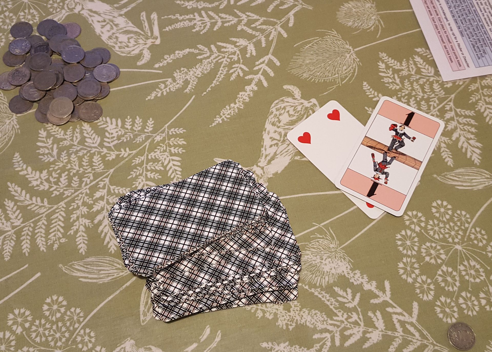 In England ist es -aus nahe liegenden Gründen- besonders schwer Cego-Spieler zu finden, wenngleich eine kleine und extrem passionierte Community besteht! Je weniger Spieler es gibt, desto eher muss man sich über Spielvarianten zu zweit Gedanken machen. Freunde aus Dorset, Jo und Paul Eaton von Englands Südküste, haben dies getan und folgende Regeln für zwei Spieler entwickelt. Das normale Offiziers-Cego war ihnen zu langweilig. Das Spiel zu zweit entsprich dem Spiel zu dritt. Der Spieler spielt gegen einen Gegner der mit 2 Blättern spielt. Eins verdeckt und eins offen auf dem Tisch liegend. Die beiden Spieler steigern ganz normal. Das dritte Blatt ist noch verdeckt. Erst wenn einer der beiden Spieler das Spiel ersteigert hat, wird das 3. Blatt umgedreht. Man kann sich freiwillig bis auf zwei Leere selber hochsteigern. Paul und Jo spielen mit folgenden Sonderspielen: Ulti, Räuber und Drescher. Beim Räuber und beim Drescher bleibt das 3. Blatt verdeckt. Dieses Spiel ist auf jeden Fall auch im Schwarzwald zur Nachahmung geeignet, wenn der dritte Spieler mit Grippe im Bett liegt, Cego-Online spinnt, oder die Kinder aus dem Haus sind.