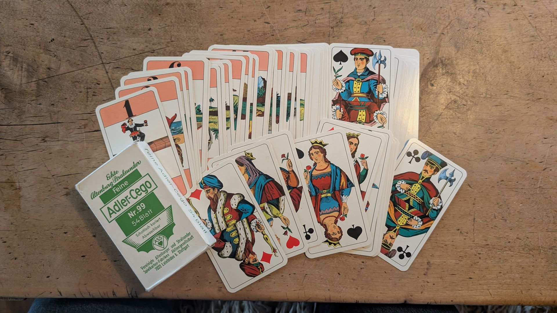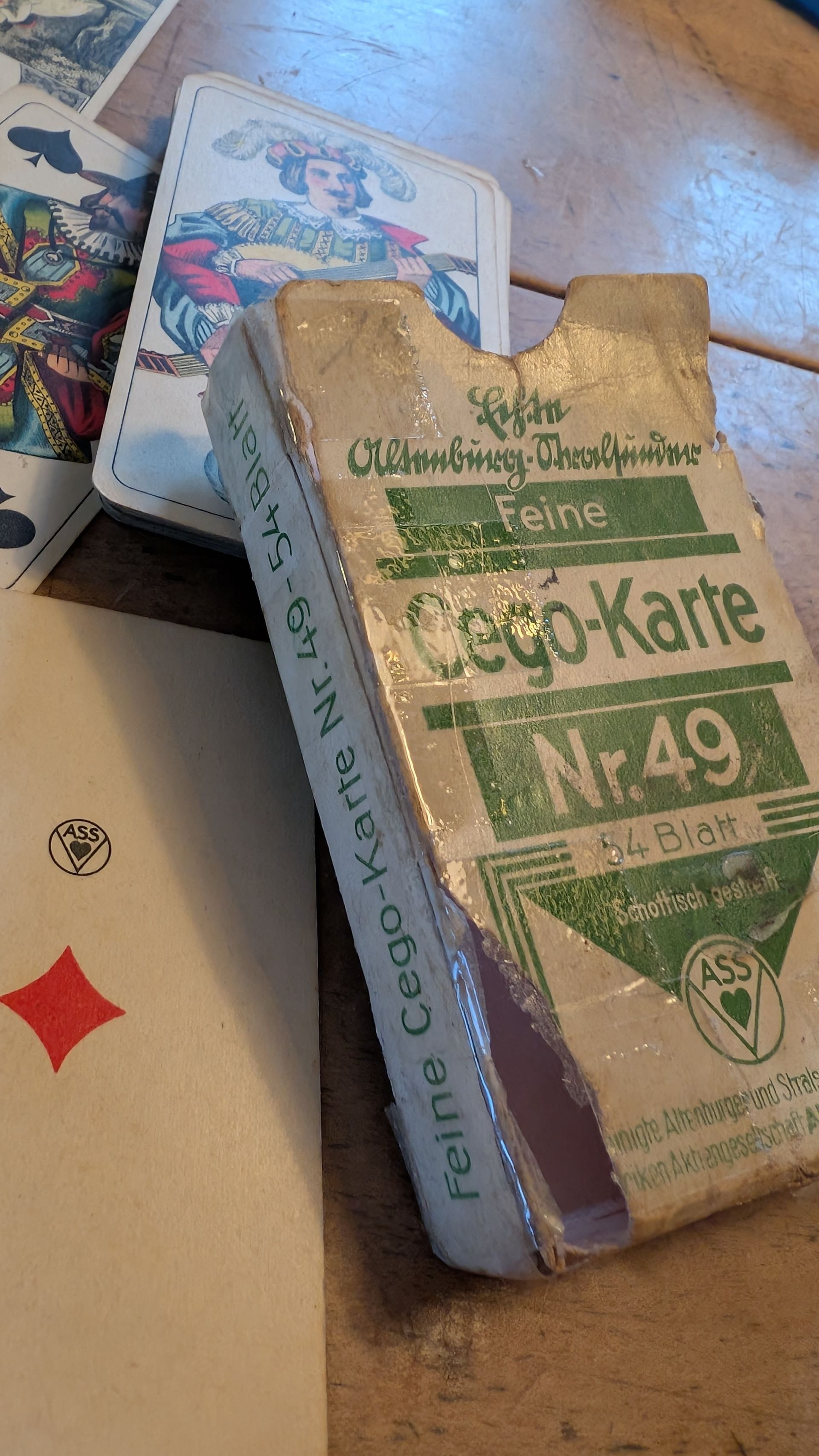 Firma Altenburger (ASS). Ca 1940 bis 1944. Guter Zustand. Bespielt, aber nicht geknickt und nicht beschädigt. Ein kleiner Fleck auf Trumpf 3 (siehe Bild). Schachtel in wenig gutem Zustand.